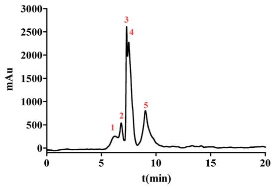 The chromatograms measured at 220 nm of SPD-VII by NGC Quest™ 10 Plus Chromatography System. The red numbers 1-5 represent peaks 1-5 respectively.