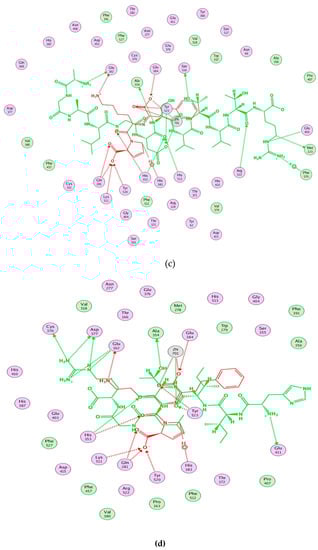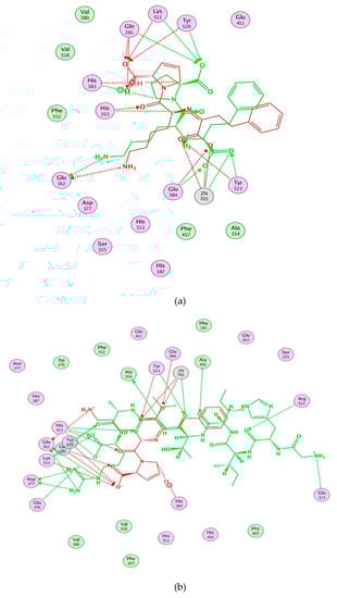 Molecular modeling of the interaction between inhibitors and ACE. (a) Molecular modeling of the interaction between lisinopril and ACE. (b) Molecular modeling of the interaction between GHIITVAR and ACE. (c) Molecular modeling of the interaction between AGALGDSVTVTR and ACE. (d) Molecular modeling of the interaction between HIITLGR and ACE. The ACE-lisinopril complex (1O86.pdb) was used as a template. The structure of lisinopril is in red and the peptides is in green. Hydrophobic, polar, and acidic residues of ACE are represented by green, violet, and red rings, respectively. Green and red arrows show hydrogen bonds from donor atom to acceptor.