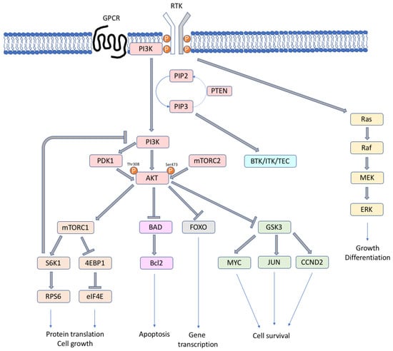 The various forms of PI3K play different roles, among them memory storage and retrieval [,], metabolism and insulin signaling [], and immunity []. The activated form of the lipid kinases PI3Ks phosphorylates the 3′-hydroxyl group of plasma membrane phosphoinositides (PtdIns), producing three types of second messengers: phosphatidylinositol 3-monophosphate (PI(3)P), phosphatidylinositol 3,4-biphosphate (PI(3,4)P2), and phosphatidylinositol 3,4,5-triphosphate (PI(3,4,5)P3/PIP3) []. The PIP3 levels are regulated by PTEN (phosphatase and tensin homolog), which is an important tumor suppressor, with phosphatase activity that is able to convert PIP3 to PI(3,4)P2. When the second messenger PIP3 is formed, downstream PI3K targets, such as AKT and mTOR, are activated (Figure 1). PIP3 binds and phosphorylates AKT at Ser473 by the mammalian target of rapamycin complex 2 (TORC2) and at Thr308 by phosphoinositide-dependent protein kinase-1 (PDK1) []. The activation of AKT is maximal when both sites are phosphorylated, and it leads to the phosphorylation of large spectra of proteins that are involved in cell growth, survival and progression, protein synthesis, and metabolism [,,]. AKT can activate TORC1 complex, which regulates ribosomal protein S6 kinase 1 (S6K1, or p70S6K), eukaryotic translation initiation factor 4E-binding protein 1 (4EBP1), two key regulators of protein synthesis [], RAS/ERK, forkhead/winged helix box class O (FOXO) family, and other pathways. AKT inhibits the apoptotic pathway by negatively regulating the pro-apoptotic Bcl2 family proteins and mediating p53 degradation. In lymphocytes, the TEC family tyrosine-kinase proteins BTK (bruton tyrosine kinase), ITK (IL2 inducible T-cell kinase), and TEC are PI3K effectors that are activated by PIP3, with potential anti-tumor therapeutic implications. TORC1 or S6K1 are involved in a negative feedback regulation loop; their activation leads to the deactivation of the PI3K, AKT, and ERK pathway [,].