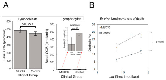 Ex vivo lymphocytes are metabolically quiescent and myalgic encephalomyelitis/chronic fatigue syndrome (ME/CFS) lymphocytes die more rapidly. Error bars are standard errors of the mean. (A) Basal oxygen consumption rates (OCR) was measured in lymphoblasts and lymphocytes from ME/CFS and control individuals. Lymphoblasts: each ME/CFS (n = 50) and control (n = 22) cell line was assayed over four replicates in at least three independent experiments. Lymphocytes: each ME/CFS (n = 14) and control (n = 9) cell line was assayed over four replicates once due to limited supply. The red arrows point to the same data magnified with a smaller Y axis scale. The low basal OCRs for lymphocytes match those previously reported [8]. (B) ME/CFS lymphocytes die more rapidly than healthy controls. Lymphocytes from ME/CFS patients (n = 35) and healthy controls (n = 14) were seeded at a density of 1 × 106 viable cells/mL in RPMI 1640 with 10% serum and kept in a humidified 5% CO2 incubator at 37 °C during the experiment. Each point represents the mean percentage of dead cells at the corresponding time point for ex vivo lymphocytes from ME/CFS patients and healthy controls. Stepwise multiple regression analysis was performed with dummy variables allowing both slopes and intercepts to differ between groups, with removal of least significant regression variables until only significant coefficients remained. The difference in the slopes (death rates) of the log-linear regressions between the ME/CFS and control group was statistically significant (t test).