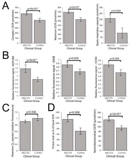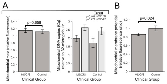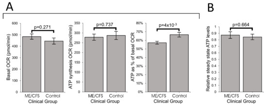 Mitochondrial function is of interest to ME/CFS research as a bioenergetic explanation for the recurrent fatigue and the myriad links between the disorder’s characteristic immune inflammation and the mitochondria [3]. Evidence for mitochondrial dysfunction in ME/CFS has been sought in the last decade, yet remains inconsistent. Reduced mitochondrial biogenesis but not normalized respiratory chain enzyme activities have been reported in the muscle of ME/CFS individuals [4]. Muscle mitochondrial biogenesis is upregulated by exercise [5], so this reduction is likely to be caused by the necessarily reduced exercise that ME/CFS patients can undertake. Mitochondrial respiratory function in ME/CFS neutrophils [6,7] and peripheral blood mononuclear cells (PBMCs) is reportedly reduced [8] or unchanged [9], yet the oxidative phosphorylation (OXPHOS) complexes appear normal [10,11], while the expression of genes encoding mitochondrial proteins in patient saliva, platelets, and lymphocytes is elevated [12,13,14]. Most recently, mitochondrial respiration was found to be unchanged in resting and stimulated CD4+ and CD8+ T cells, with the sole exceptions of a small reduction in the proton leak in resting and ATP synthesis in stimulated CD8+ cells [15].