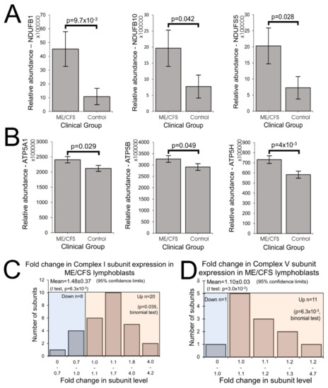 These results suggest that in ME/CFS cells the expression of the respiratory complexes is homeostatically increased to compensate for inefficient ATP synthesis. To test this hypothesis further, we conducted whole cell proteomics analysis of 16 control and 22 patient lymphoblast cell lines. For several of the individual subunits of both Complexes I and V, the measured increase in expression of that subunit alone exceeded the threshold for statistical significance (Complex I—Figure 4A, Figure S5 Panel 3A; Complex V—Figure 4B, Figure S5 Panel 3B). Thirty-one of the 44 Complex I subunits were detected, 26 of these in more than five samples and most exhibited increases in their levels in ME/CFS cells compared to the controls (Figure 4C, Table S1), significantly more than would be expected by chance. The average expression of the Complex I subunits in ME/CFS cells was significantly higher than in the controls (1.48 fold, p = 6.3 × 10−3). Eleven of the 12 Complex V subunits were upregulated, a significantly higher fraction than would be expected by chance (Figure 4D, Table S1). Average expression levels were also significantly elevated for the subunits of Complex V (1.1 fold, p = 3.0 × 10−3). Similar results for both complexes were found when the t test included only subunits detected in more than five samples (Table S1). Taking into account this 10% higher expression of Complex V subunits, the relative inefficiency of Complex V in the ME/CFS cells is even greater than measured directly by respirometry—almost 25% lower than the controls.