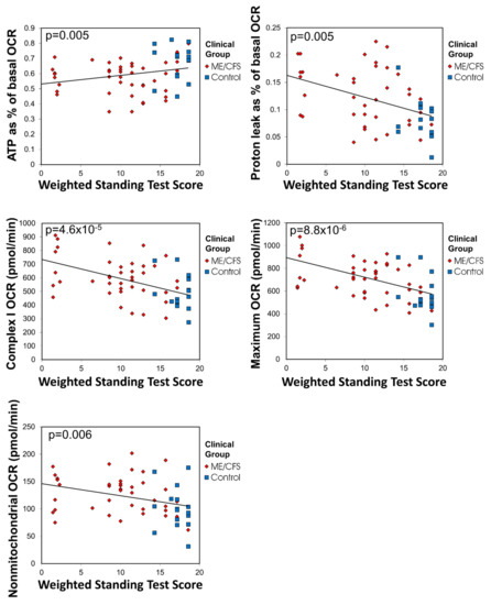 In view of the foregoing functional abnormalities in ME/CFS mitochondria, we tested the key elevated parameters (Figure 5) for correlation with disease severity as assessed by the Richardson and Lidbury Weighted Standing Test [24]. We found that all were correlated with the clinical outcomes. This provides strong evidence for the idea that the mitochondrial abnormalities we found are clinically relevant.