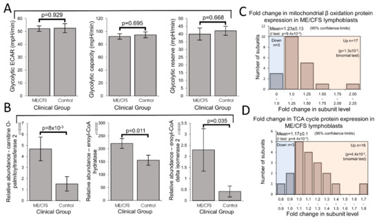 Previous metabolomic studies have suggested that lipid metabolism is dysregulated in ME/CFS [16,27,28,29]. Since the elevated “proton leak” and “nonmitochondrial” OCR were consistent with an increase in mitochondrial uptake and catabolism of alternative oxidizable substrates, we investigated the expression of mitochondrial fatty acid transporters enzymes responsible for fatty acid β-oxidation in whole cell proteomes of ME/CFS and control lymphoblasts. We found proteins in both groups to be significantly elevated in the ME/CFS cells (Figure 7B,C; Figure S9 Panel 2B). The levels of all three fatty acid transport proteins, carnitine acyltransferase I and II as well as the acyl carnitine carrier protein, were elevated, although this reached statistical significance only in the case of carnitine acyl transferase II. Furthermore, 17 of 20 proteins involved in mitochondrial β oxidation were upregulated (binomial test, p = 2.6 × 10−3), with average levels 23 ± 13% higher than controls (t test, p = 9.4 × 10−4). All six of the central enzymes in the mitochondrial β oxidation cycle were upregulated (binomial test, p = 0.016) and the level of one of these (enoyl-CoA hydratase) was significantly elevated on its own. If the rates of mitochondrial β oxidation were elevated in ME/CFS cells in accordance with the expression of the proteins involved, these pathways would provide acetyl CoA to the TCA cycle at faster rate. In keeping with this, we found that the expression of TCA cycle proteins was also elevated in ME/CFS lymphoblasts (Figure 7D). Thus, 16 of 19 detected proteins involved in the TCA cycle were more abundant in the ME/CFS proteome (binomial test, p = 2.2 × 10−3). The mean expression level of TCA cycle proteins in ME/CFS lymphoblasts was 17 ± 10% higher than in the control cells (t test, p = 1.0 × 10−3). Taken together, these results show that ME/CFS lymphoblasts have an increased capacity for using mitochondrial β oxidation to drive oxidative phosphorylation at rates faster than would otherwise have been the case.
