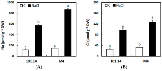 The concentrations of Na+ and Cl− significantly increased in both genotypes treated with NaCl for 21 days (Figure 1). The accumulation of Na+ was higher than that of Cl−, suggesting that the toxic effect occurring at this time could be ascribed mainly to the accumulation of this cation. Despite the greater ability to respond to salt stress [17], the levels of Na+ were higher in M4 than in 101.14, supporting the idea of a possible difference between the two genotypes in the capability to compartmentalize Na+ in the vacuole.