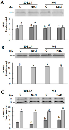 Taken together, these results highlighted that 101.14 and M4 had a similar capacity to transport Na+ into the vacuole in the control condition and that this activity was not affected by the salt treatment. Differently, the two genotypes could have a different capability of sustaining the proton gradient necessary to drive the sequestration of Na+ into the vacuole. In other words, the comparison between the two genotypes supports the idea that 101.14 could have a constitutively lower capability than M4 to pump H+ into the vacuole, that is further reduced under salt stress conditions. This aspect could be related to the previous observation that M4 showed a greater capability to cope with an adverse condition represented by salt stress [17]. In this view, the greater amounts of Na+ absorbed from the soil by M4 may be transported more efficiently into the vacuolar compartment (Figure 1A and Figure 2C).
