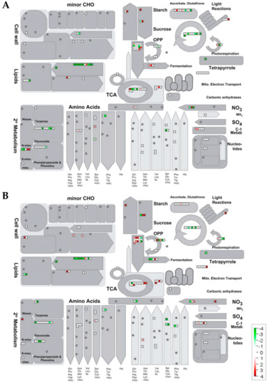 MapMan metabolism overview maps of the changes induced by salt stress condition. Changes in protein abundances (salt stress versus control) occurring in 101.14 (A) and M4 (B) grapevine rootstocks. Values are given in logarithmically scaled (base 1.2) signal intensities: red, increase; white, no change; green, decrease (see color scale).