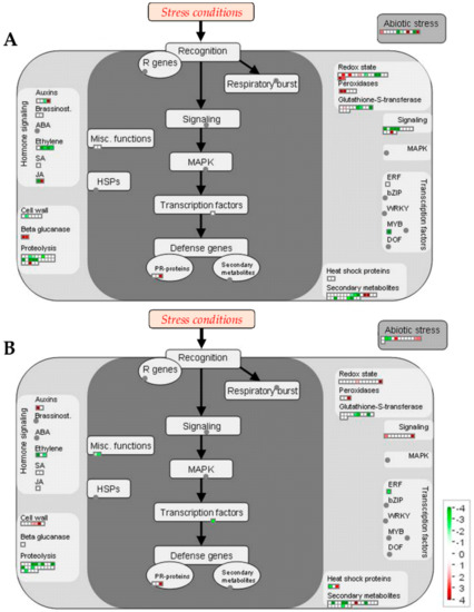 Changes in the MapMan overview related to stress pathways induced by salt stress. Changes in protein abundances (salt stress versus control) occurring in 101.14 (A) and M4 (B) grapevine rootstocks. Values are given in logarithmically scaled (base 1.2) signal intensities: red, increase; white, no change; green, decrease (see color scale).