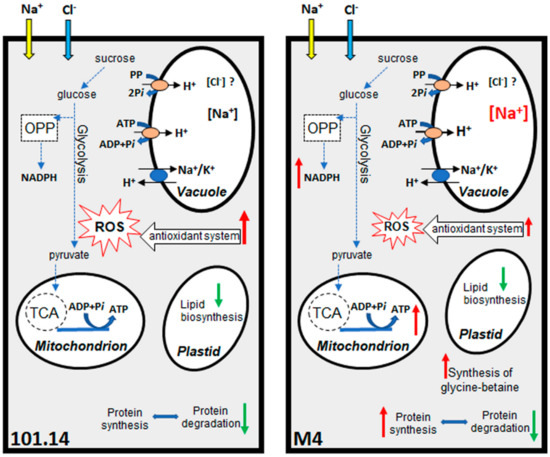 The reduction in the energetic metabolism may also depend on factors other than those referable to direct toxic effects of NaCl in root cells. In this view, an important aspect to consider is that the sugar availability in the root could decrease, since photosynthesis is affected by salt stress. Previously, in the same experimental conditions, a reduction of the net CO2 assimilation by 80% in 101.14 and by 35% in M4 was measured [17]. In this context, it is interesting to stress the dramatic increase in abundance of sucrose synthase in 101.14 (#184, + 150 folds) and its much lower increase in M4 (#89 and #152, + 11 and + 3-folds, respectively). This result fits well with a greater and lesser necessity of the two genotypes (101.14 and M4, respectively) to strengthen the import of photoassimilates in roots, in which sucrose synthase plays a pivotal role [35]. It could be observed that the toxic effects occurring in the leaf tissue evoke in roots metabolic responses that are apt at increasing sink strength. In this stress condition, the carbon skeletons imported from the phloem would be mainly used to sustain energy metabolism, rather than to synthesize starch, as suggested by the decrease in abundance of a few plastidial enzymes involved in carbohydrate metabolism. According to this observation, the effect was more evident in 101.14 than in M4 (Figure 3, Table 2 and Table 3).