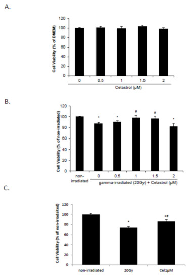 2.1. Celastrol Dose-Dependently Reversed Gamma Irradiation-Induced Decrease in Cell Viability