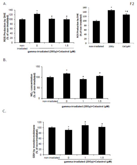 2.2. Celastrol Blocked the Increased Reactive Oxygen Species (ROS) and NO Production and Decreased Glutathione (GSH) Levels Induced by Gamma Irradiation