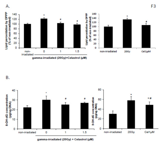 2.3. Celastrol Reversed the Increased Lipid Peroxidation and DNA Oxidative Damage Induced by Gamma Irradiation