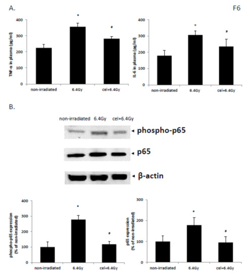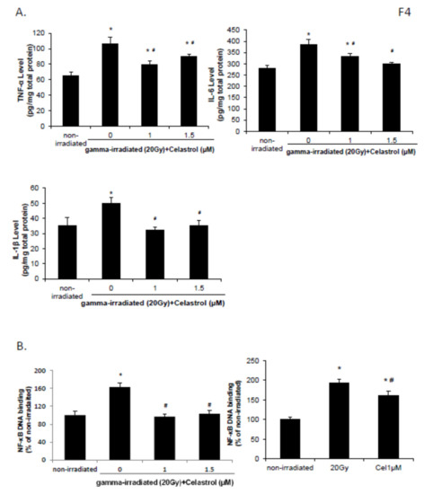 2.4. Celastrol Blocked the Increased Levels of proInflammation Cytokines and the Activation of NF-κB Pathway Induced by Gamma Irradiation