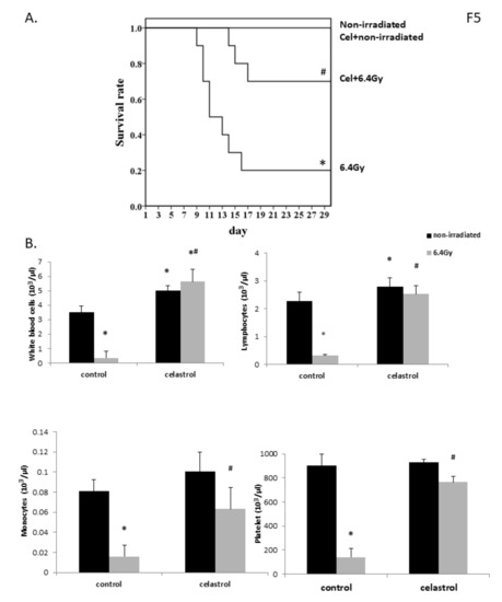2.5. Celastrol Treatment Significantly Increased Mouse Survival Rate Following Gamma Radiation Exposure
