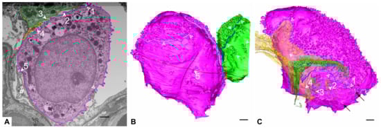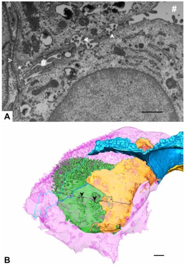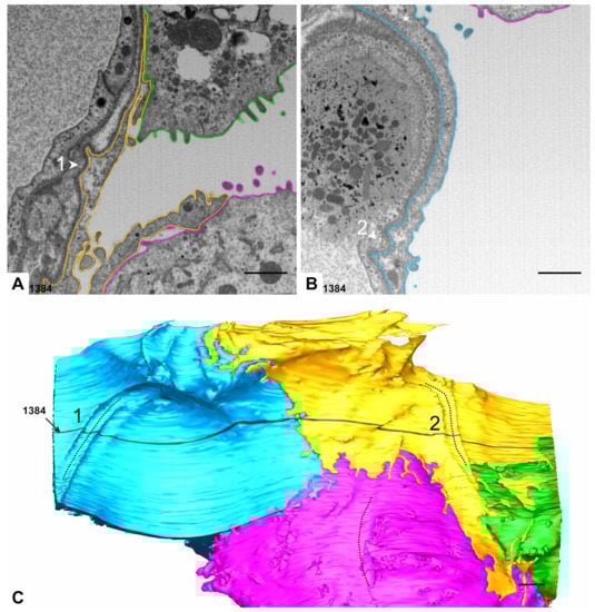 Type 1 alveolar epithelial (AE1) and type 2 alveolar epithelial (AE2) cells form the epithelial lining of alveoli in the human lung. Both are essential for normal lung function: AE1 cells cover the majority of the alveolar surface with thin cytoplasmic extensions that participate in a very thin blood gas barrier and AE2 cells serve as the regeneration source for the alveolar epithelium and secrete the pulmonary surfactant, which lowers the surface tension at the air liquid interface and, thus, prevents alveolar collapse [], see also []. In the past, it was suggested that these cells may show complex morphological properties, such as having more than one apical surface for serving different alveoli or branching of AE1 cells [,]. Sirianni et al. [] described basolateral microvilli on AE2 cells for contacting interstitial fibroblasts and AE1 cells that extend both above and underneath AE2 cells. In a recent study, three entire AE1 cells were modeled in three dimensions (3D) by manual segmentation of a serial block-face (SBF) scanning electron microscopic data set of a human lung sample. Both the branching capability and the chance of having more than one apical surface could be confirmed for AE1 cells by this method. Additionally, the 3D data set revealed that different branches of the same cell can form cellular junctions between each other []. During this study the questions arose how the sites of contacts both between AE1 and AE1 and between AE1 and AE2 cells as well as the lateral borders of AE2 cells are configured in 3D. The SBF data suggested a complex morphology of AE1/AE2 cell contacts, variable overlap of adjacent AE1 cells and the existence of numerous microvilli that may appear clustered in small niches of the basolateral AE2 cell surface, findings in line with those of Sirianni et al. [] and Mercurio and Rhodin [,]. A special 3D organization of the contact sites may be of relevance for the mechanical stability (or behavior) and integrity of the alveolar epithelium during breathing or the migration of cells from the interstitial space into the alveolus. Knowledge about the detailed 3D organization of the basolateral cell membrane of AE2 cells may help to understand the crosstalk between AE2 and other cells of the septal wall.