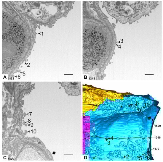 Luminal surface of AE1 cells. (A–C) Images 1172, 1348 and 1520 of the dataset. Filled arrowheads 1 and 2 (A) indicate profiles of microvilli. Filled arrowheads 3 and 4 (B) indicate microvilli with a shared basis. Empty arrowheads 5 and 6 (A) and 7–10 (C) indicate profiles of plasma membrane protrusions filled with cytoplasm. The hash key indicates a region with smooth AE1 luminal surface. (D) Detail of the 3D model. Arrowheads and hash key refer to the particular profiles in A–C. The particular section planes 1172, 1348 and 1520 are labeled and emphasized by black color in the model. The different thickness of these black markings is caused by different segmentation intervals in these regions. Note the smooth surface of the cell in the center of the image and the surface enlargements around. Some of them seem to be concentrated in a surface cavity (asterisk). Scale bars: 1 m.