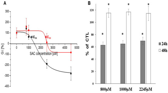 The cell viability after the 24 h and 48 h incubations with 800 µM, 1000 µM and 2245 µM SAC in the MCF-7 cell culture (A) generated by OriginPro 9.1 program, (B) the MTT assay; Gi: growth inhibition, IC50: half maximal inhibitory concentration. The sigmoidal model of effect dependence on SAC dose was adjusted to the obtained data according to the method described in Lasota et al. [19]. All the data of the mean value represent the average of four to five determinations in three experimental groups. Statistical analysis was performed using the Mann–Whitney test (* p < 0.05), * p < 0.05 vs. the control.