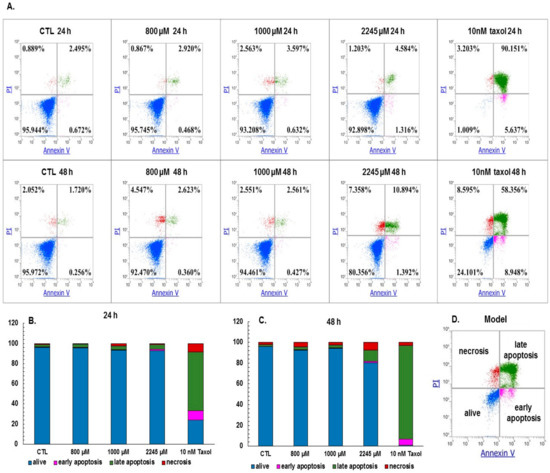 Dot plot showing the result of the annexin/propidium iodide test (A) The abscissa axis represents FC fluorescence associated with annexin V, the ordinate axis shows the propidium iodide fluorescence. The effect of SAC in concentrations 800 µM, 1000 µM and 2245 µM and 10 nM taxol (T) on the survival of the individual MCF-7 cell line after the 24 h and 48 h incubations (B,C), Model: the graphs show the cells: the lower left square shows that which is alive; the upper left square indicates necrosis; the right lower square portrays early apoptosis; the upper right square gives late apoptosis (D).