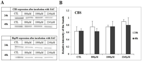 While investigating the effect of SAC upon expression, we did not observe statistically significant changes of CBS and MPST expressions after the 24 h and 48 h incubations with 800 µM, 1000 µM and 2245 µM SAC (Figure 3 and Figure 4). The changes in the level of the tested enzymes were observed for CTH, especially for the highest concentrations of the SAC used. Thus it was concluded that SAC may reduce the CTH expression. We confirmed a statistically significant decrease in the relative intensity for the CTH bands after the 24 h and 48 h incubations with 2245 µM of SAC with densitometry measurements (Figure 5B).