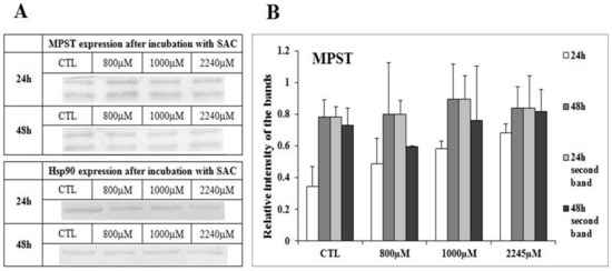 The expression of 3-mercaptopyruvate sulfurtransferase (MPST) in the breast cancer cell line (MCF-7) after the 24 h and 48 h incubations with SAC. The tested concentrations of SAC in culture medium as listed: 800 µM, 1000 µM and 2245 µM, while the control refers to non-treated cells. (A) Western blot with immunodetection. Each experiment was done tree times in triplets, and a representative experiment is shown. Hsp90 is used as a control of equal loading. (B) Densitometric visualization of expression of MPST. The error bars represent standard deviation.