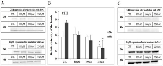 The expression of γ-Cystathionase (CTH) in the breast cancer cell line (MCF-7) after the 24 h and 48 h incubations with SAC. The tested concentrations of SAC in culture medium as listed: 800 µM, 1000 µM and 2245 µM; the control refers to non-treated cells. (A) Western blot with immunodetection. Each experiment was done tree times in triplets, and a representative experiment is shown. Hsp90 is used as a control of equal loading. (B) Densitometric visualization of the expression of CTH. The error bars represent the standard deviation. (C) Western blot with chemiluminescence detection. Statistical analysis was performed using the Mann–Whitney test (* p < 0.1 ** p < 0.05, 800 µM, 1000 µM, 2245 µM SAC vs. control).