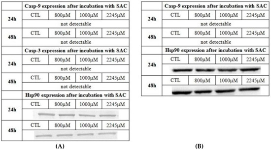 The expression of caspase-3 (casp-3) and caspase-9 (casp-9), in the breast cancer cell line (MCF-7) after the 24 h and 48 h incubations with SAC. The tested concentrations of SAC in culture medium as listed: 800 µM, 1000 µM and 2245 µM, and the control refers to non-treated cells (A) Western blot with immunodetection. Each experiment was done tree times in triplets, and a representative experiment is shown. Hsp90 is used as a control of equal loading. (B) Western blot with chemiluminescence detection.
