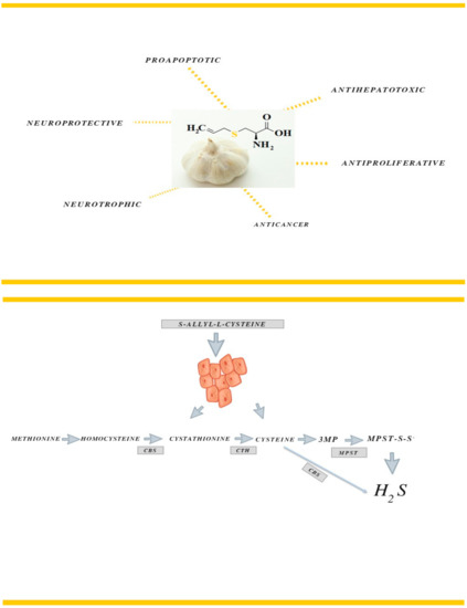 Aged garlic extract (AGE) is an odorless garlic preparation containing S-allyl–L-cysteine (SAC) (Scheme 1) as its most abundant compound. A large number of studies have demonstrated the antioxidant activity of AGE and SAC in both in vivo, that is, in diverse experimental animal models associated to oxidative stress, and in vitro conditions, using several methods to scavenge reactive oxygen species (ROS) or to induce oxidative damage [1]. The various data presented its anticancer, antihepatotoxic, as well as neuroprotective and neurotrophic activity [6,7,8]. Welch et al. [9] reported that SAC suppressed the proliferation of LA-N-5 human neuroblastoma cells. In prostate, ovarian, nasopharyngeal and esophageal cancer cell lines, the suppression of invasive growth was proven by Chu et al. [10]. SAC also inhibited the tumor progression in a mouse xenograft model of oral cancer in the experiments presented by Pai et al. [11]. In the hepatocellular carcinoma MHCC97 cell model the authors investigated the SAC influence on the cancer proliferation and metastasis. They reported the induction of apoptosis within the investigated range of concentrations as well as the decrease in the growth and proliferation [12]. This garlic derivative was also shown to suppress proliferation and induce apoptosis in human ovarian cancer cells in vitro [13]. The anticancer effect of S-allyl-L-cysteine via the induction of apoptosis is also mentioned in the Ho research regarding human bladder cancer cells [7].