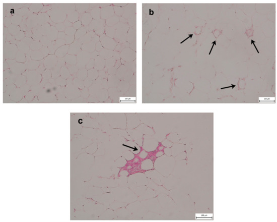 Epididymal fat histology (a) in mice fed a control diet (CD) and (b,c) Western-style diet (WD). Macrophage infiltration showing formation of crown-like structures (indicated by arrows) characteristic of stressed insulin-resistant dying adipocytes in the WD group. No indications of inflammation are seen in the CD group.