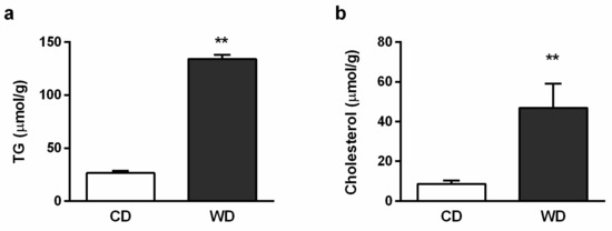 Hepatic lipids in mice fed a control diet (CD) and a Western-style diet (WD). (a) Total triglycerides (TGs) and (b) cholesterol content. The results are expressed as the means ± SD; ** p < 0.01 (n = 6 each group).