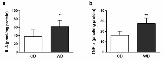 Hepatic inflammatory cytokines in mice fed a control diet (CD) and a Western-style diet (WD). (a) Levels of liver interleukin 6 (IL-6) and (b) tumor necrosis factor alpha (TNF-α). The results are expressed as the means ± SD; * p < 0.05, ** p < 0.01 (n = 6 each group).