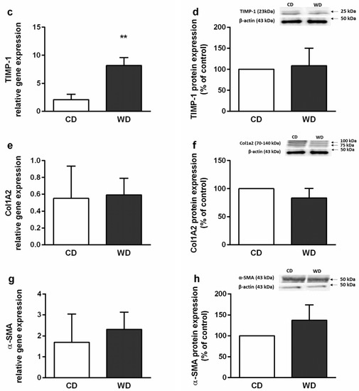 Markers of hepatic fibrosis and stellate cell activation in mice fed a control diet (CD) and a Western-style diet (WD). (a) Tumor growth factor beta (TGF-β) gene and (b) TGF-β protein expression. (c) Tissue inhibitor of metalloproteinase-1 (TIMP-1) gene and (d) TIMP-1 protein expression. (e) Collagen type I alpha 2 chain (Col1A2) gene and (f) Col1A2 protein expression. (g) Alpha smooth muscle actin (α-SMA) gene and (h) α-SMA protein expression. The results are expressed as the means ± SD; ** p < 0.01 (n = 4–5 each group). Representative Western blot images are shown in graphs.