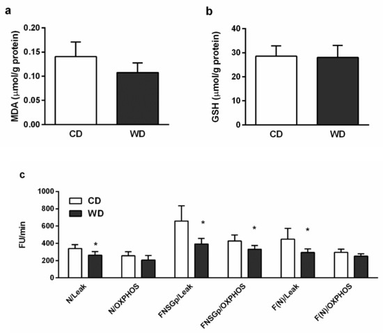 Markers of hepatic oxidative stress in mice fed a control diet (CD) and a Western-style diet (WD). (a) Concentration of hepatic malondialdehyde (MDA). (b) Concentration of hepatic reduced glutathione (GSH). (c) Reactive oxygen species (ROS) production in liver homogenate measured as fluorescence changes in dichlorofluorescein. LEAK, measurements in the absence of adenosine diphosphate (ADP); oxidative phosphorylation (OXPHOS), measurements in the presence of ADP (2.5 mM); N, NADH-linked substrates (pyruvate, 5 mM; glutamate, 10 mM; malate, 2 mM); FNSGp, fatty acid (octanoylcarnitine, 0.5 mM) plus NADH-linked substrates plus succinate (10 mM) and glycerophosphate (10 mM); F(N), octanoylcarnitine (0.5 mM) plus malate (2 mM). The results are expressed as the means ± SD; * p < 0.05 (n = 6 each group).