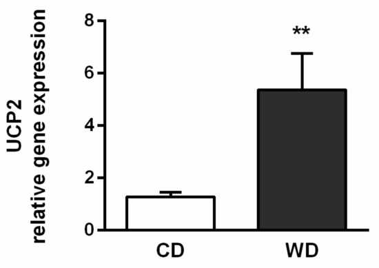 Uncoupling protein 2 (UCP-2) gene expression in mice fed a control diet (CD) and a Western-style diet (WD). The results are expressed as the means ± SD; ** p < 0.01 (n = 4 each group).