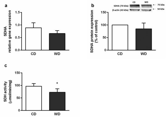 Hepatic succinate dehydrogenase (SDH) in mice fed a control diet (CD) and a Western-style diet (WD). (a) SDH subunit A (SDHA) relative gene expression. (b) SDH subunit A protein expression. (c) SDH enzymatic activity. The results are expressed as the means ± SD; * p < 0.05 (n = 4–6 each group).