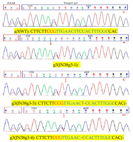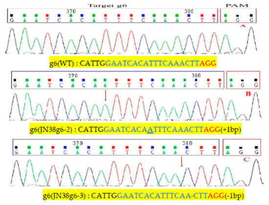 Further analysis of mutant plants from the T3 generation showed that CRISPR/Cas9 technology produced the following mutation types: homozygous mutations, heterozygous mutations and double allele mutations. In target g3, we selected three homozygous Transfer DNA(T-DNA) free plants (JN38g3-1, JN38g3-3, JN38g3-4), the JN38g3-1 showed common type of homozygous mutation 1 bp insertions, and the proportion of this mutation was approximately 66.7% (Figure 1B). The JN38g3-3 showed common type of mutation was 1 bp deletion, and the proportion of which was approximately 16.6% (Figure 1C). The JN38g3-4 showed proportion of the 2 bp deletion was approximately 16.7% (Figure 1D). For the g6 single target (JN38g6-2, JN38g6-3), the following mutation types were detected: The JN38g6-2 showed common type was 1bp insertion with a proportion was 50% (Figure 2B); and the JN38g6-3 showed type 1bp deletion with a proportion of 50% (Figure 2C). For the g36 double target(JN38g36-3, JN38g36-5), the following mutation types were detected: the JN38g36-3 showed type 1 bp insertion and 1 bp deletion with a proportion of 50% (Figure 3C,D), the JN38g36-5 showed type was 2 bp and 7 bp deletions with a proportion of 50% (Figure 3E,F).