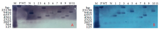 PCR-positive T3 genomic DNA was extracted from the leaves of transgenic plants using the BamHI restriction endonuclease and purified Bar as a probe using the DIG DNA Labeling and Detection Kit I (Roche, Company, Basel, Swiss) according to the manufacturer’s instructions. DNA was used for probe-labelled sample preparation, hybridisation, membrane transfer, membrane cleaning and staining procedures to detect the corresponding Southern blotting hybridization (see Section 2.5).
