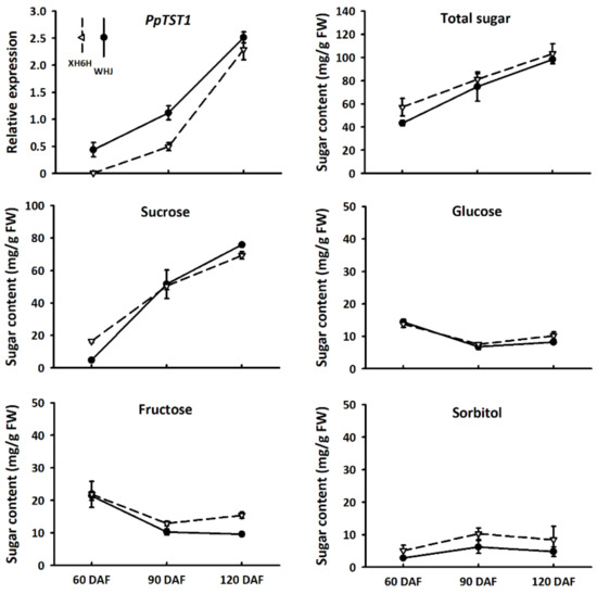 To investigate whether PpTST1 had a potential role in the regulation of sugar accumulation in peach fruit, its expression profile along with sugar accumulation were examined in peach fruit (cvs. Xiahui 6 (XH6H) and Wanhujing (WHJ)) at different stages of development. As a result, PpTST1 showed an increase in expression levels throughout fruit development, with a peak at the mature stage (120 days after full bloom (DAF)) (Figure 1). Sucrose was the predominant sugar in mature fruits of both XH6H and WHJ, accounting for 67% and 77% of total sugars, respectively. The contents of both sucrose and total sugars showed an increasing trend throughout fruit development. However, the contents of glucose, fructose, and sorbitol showed slight changes throughout fruit development. Overall, the expression profile of PpTST1 displayed a consistency with the sugar accumulation pattern in peach fruits, suggesting a potential role of PpTST1 in the regulation of fruit sugar accumulation.