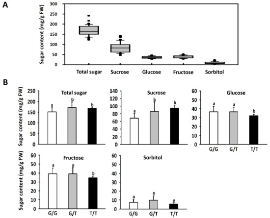 The sugar content in mature fruits of peach cultivars was measured (Figure 3A). Sucrose was found to be the predominant sugar, and its content ranged from 46.9 to 143.0 mg/g fresh weight (FW), with an average of 84.6 mg/g FW. Total sugar content ranged from 122.4 to 241.0 mg/g FW, with an average of 168.8 mg/g FW. These results indicated that the contents of sucrose and total sugars showed wide variation among cultivars. By contrast, the content of glucose, fructose, and sorbitol exhibited a small degree of variation. As mentioned above, all of the tested cultivars were divided into three genotypes based on the G/T SNP in the third exon of PpTST1. Comparison of the sugar content between different genotypes revealed that cultivars with either G/T or T/T genotypes had significantly higher sucrose and total sugar content than cultivars with the G/G genotype (Figure 3B). In contrast, cultivars with either G/G or G/T genotypes showed significantly higher fructose and glucose contents than cultivars with the T/T genotype. However, no significant difference in sorbitol content was observed between different genotypes. Taken together, these results suggest that PpTST1 has an impact on fruit sugar accumulation in the peach.