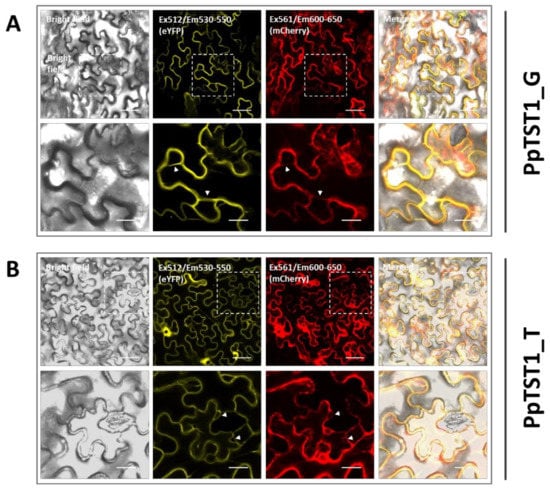 Interestingly, the G/T variant in the third exon of PpTST1 determines a histidine (His) to glutamine (Gln) substitution in the seventh transmembrane domain that was predicted using the Protein Homology/analogY Recognition Engine V 2.0 [33] (Figure S1A,B). To determine whether the His → Gln substitution had an effect on subcellular localization, full-length coding sequences of PpTST1_G and PpTST1_T were individually fused with yellow fluorescent protein (YFP) to generate PpTST1_G-YFP and PpTST1_T-YFP constructs under the control driven by the CaMV 35S promoter, respectively. These two constructs were transiently expressed in leaves of Nicotiana benthamiana. Both PpTST1_G-YFP and PpTST1_T-YFP fusion proteins were found to reside in the tonoplast (Figure 4). To clarify the tonoplast location of the proteins from two allele gene, co-localization was conducted using the standard vacuolar membrane marker Vac-rk CD3-975 [34]. The YFP fluorescence of PpTST1-YFP was completely merged with mCherry fluorescence of the tonoplast marker Vac-rk CD3-975 (Figure 4A,B). Altogether, these results showed that two alleles of PpTST1 are both located in the tonoplast, and the G/T SNP in third exon had no effect on subcellular localization.