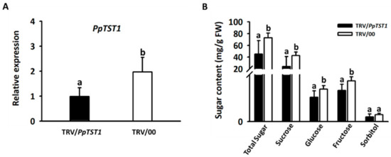 Functional analysis of the PpTST1 gene using the virus-induced gene silencing (VIGS) system in peach fruits. (A) expression of PpTST1 in peach fruit injected with pTRV2-PpTST1/pTRV1 and pTRV2/pTRV1 (control), respectively. (B) sugar accumulation in peach fruit injected with pTRV2-PpTST1/pTRV1 and pTRV2/pTRV1, respectively. Different lowercase letters indicate significant differences between fruits injected with pTRV2-PpTST1/pTRV1 and pTRV2/pTRV1 (Student’s t test at p < 0.05). pTRV2-PpTST1/pTRV1 and pTRV2/pTRV1 are indicated with TRV/PpTST1 and TRV/00, respectively. Error bars represent standard error (SE) of three biological replicates.
