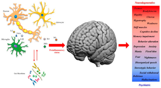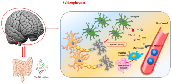 Immune dysregulation plays a role not only in neurological autoimmune brain diseases, such as multiple sclerosis, and in neurodegenerative illness, but also in many psychiatric disorders. Microglia, which represent the population of brain-residing phagocytes, can be activated to carry out the complex functions of innate immunity, in the context of inflammatory or infectious events. However, they can also interface with neuronal cells during embryonic and adult life, regulating their activity and therefore the quantity and quality of synaptic connections. These events represent the basis of subtle morpho-functional brain alterations that could influence the development of psychiatric diseases. Microglia also contribute to physiological developmental processes in CNS: they not only control the local environment by their specific processes, but during brain development, they play an important role in synaptic pruning, i.e., phagocytizing the complement-tagged synapses with the mediation of C1q and C3 complement proteins. In the adult brain, microglia play a key role in the homeostasis of synaptic circuits. The expression of purine receptors and for excitotoxic neurotransmitters enables them to sense local neuronal activity. Microglia can directly respond to diverse stimuli by physically contacting neurons via outgrowing processes and also indirectly, by modulating the neuronal firing rate by signaling molecules such as the tumor necrosis factor or by releasing extracellular vesicles [198].