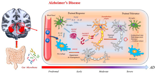 In pre-symptomatic and early AD, the immune response limits amyloid-beta plaque formation; however, the repeated triggering of microglial cells, due to the ongoing production of proinflammatory cytokines, causes a microglia detrimental trained potentiation, which contributes to disease progression. Lastly, at advanced stages of AD, high exposure to continous stimulus causes a microglia phenotypic switch into a dysfunctional senescent state with weak phagocytosis and a tolerance state characterized by the decreased release of proinflammatory compounds [16].