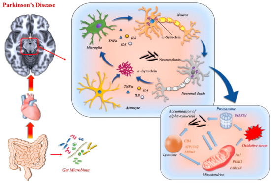 The gut microbiota has attracted much interest in recent years. It regulates the development and function of microglia and astrocytes, modulating peripheral immune responses, with important consequences for brain inflammation, and the gut microbiota–immune axis likely plays a key role in PD development [22].