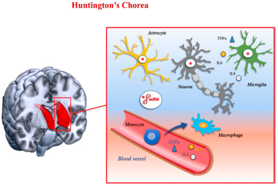 Although less explored than in other chronic degenerative diseases, the role of the immune reaction and neuroinflammation have been highlighted. Mutated huntingtin may promote the inflammatory response by a direct toxic effect, or indirectly, via mitochondrial dysfunction, as the huntingtin gene is also highly expressed in microglia and in peripheral immune system cells [126,127,128,129,130]. Innate immunity seems to play a more important role than adaptive immunity in HD. Indeed, the accompanying infiltration of adaptive immune cells into the central nervous system has only rarely been found in HD [131,132].