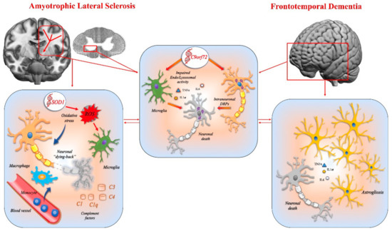 Neuroimaging, neuropathological data, and genetic studies suggest that ALS and FTD might form part of a disease continuum [143,144,145]. Indeed, a number of genes linked with ALS and FTD are involved in the same cellular pathways. The expression of many of these genes is not limited to neurons, but also involves glial cells, suggesting a multicellular pathogenesis, including those of innate immunity.