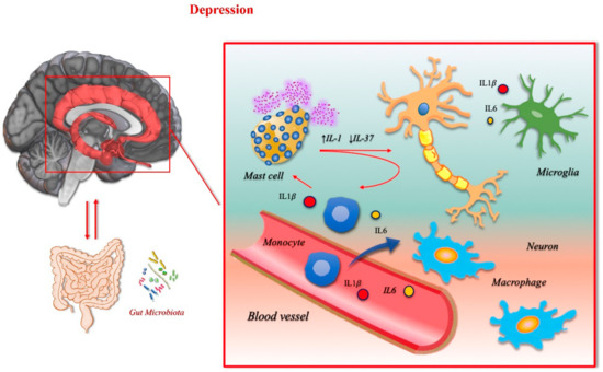 Depression may lead to MC activation and inflammation, with increased secretion of IL-1 and inhibition of IL-37. Many recent studies and meta-analyses have reported that levels of inflammation markers, such as TNFα, IL-6, and C-reactive protein (CRP), are high in depressed individuals, thus indicating a dysregulation in the immune system [203,204]. Mood changes in humans, subsequent to the injection of the typhoid vaccine [205] or lipopolysaccharide (LPS) [206], have been shown to accompany the hyper-production of pro-inflammatory compounds that modulate the toll-like receptors (TLRs) pathways [207]. Interestingly, endotoxin administration in healthy subjects compared to placebo increased serum levels of TNF and IL-6, and caused mild depressive-like symptoms, whereas sub chronic pre-treatment with the serotonin-reuptake inhibitor citalopram blunted the endotoxin-induced mood symptoms [208].
