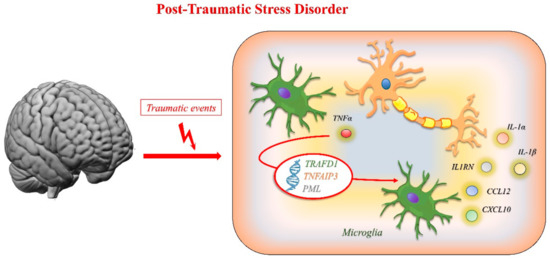 - Breen, M.S.; Maihofer, A.X.; Glatt, S.J.; Tylee, D.S.; Chandler, S.D.; Tsuang, M.T.; Risbrough, V.B.; Baker, D.G.; O’Connor, D.T.; Nievergelt, C.M.; et al. Gene networks specific for innate immunity define post-traumatic stress disorder. Mol. Psychiatry 2015, 20, 1538–1545. [Google Scholar] [CrossRef] [PubMed]