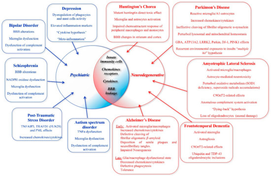 The intricate relationships between innate immunity and brain diseases raise increased interest across the wide spectrum of neurodegenerative and neuropsychiatric disorders. Barriers, such as the blood–brain barrier, and innate immunity cells such as microglia, astrocytes, macrophages, and mast cells are involved in triggering disease events in these groups, through the action of many different cytokines. Chronic inflammation can lead to dysfunctions in large-scale brain networks. Neurodegenerative diseases, such as Alzheimer’s disease, Parkinson’s disease, Huntington’s disease, amyotrophic lateral sclerosis, and frontotemporal dementia, are associated with a substrate of dysregulated immune responses that impair the central nervous system balance. Recent evidence suggests that similar phenomena are involved in psychiatric diseases, such as depression, schizophrenia, autism spectrum disorders, and post-traumatic stress disorder. The present review summarizes and discusses the main evidence linking the innate immunological response in neurodegenerative and psychiatric diseases, thus providing insights into how the responses of innate immunity represent a common denominator between diseases belonging to the neurological and psychiatric sphere. Improved knowledge of such immunological aspects could provide the framework for the future development of new diagnostic and therapeutic approaches.