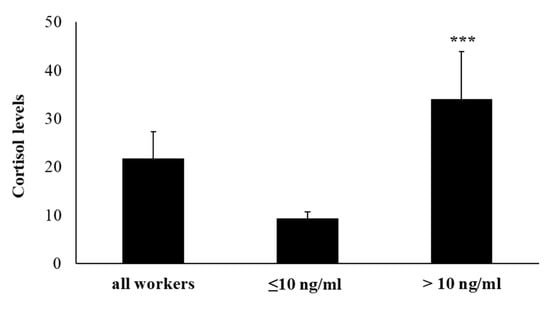 Salivary cortisol levels in all enrolled workers. Workers were divided into two groups based on salivary cortisol levels ≤ or > of 10 ng/mL. Data are reported as mean ± S.D. *** p-value ≤ 0.001.