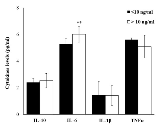 In our enrolled 80 subjects, matched for age and BMI and without disease conditions, injury or medication, we have evaluated plasma levels of several Th1 and Th2 cytokines. Based on cortisol levels ≤10 ng/mL or >10 ng/mL, the results obtained from cytokine detections were reported. Figure 2 showed that in workers with cortisol >10 ng/mL, plasma levels of IL-6 are statistically significantly higher (p ≤ 0.01), while no different levels of IL-10, IL-1β and TNFα were observed between two groups.